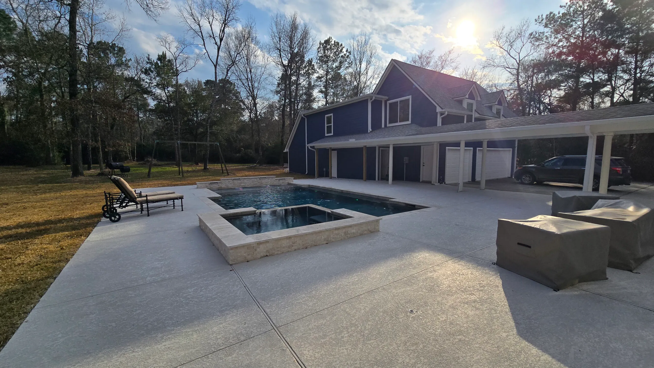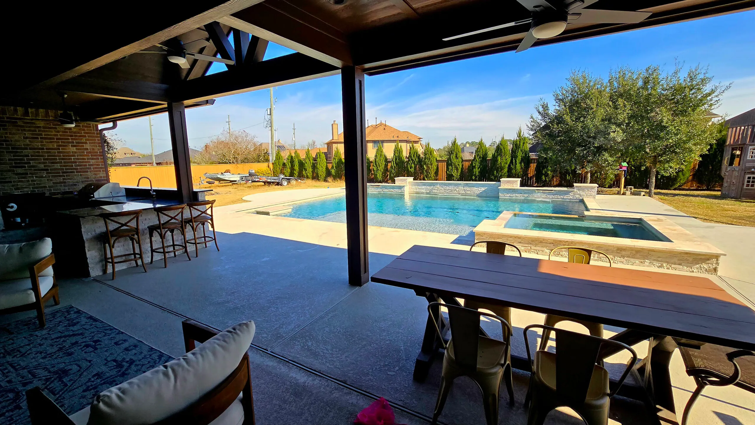 Choosing the appropriate material for the deck in your Texas home is important since it’s not merely a surface surrounding your pool but a beautiful backyard extension. We advise going with a wood deck if you want something natural because it looks cozy. However, it requires more maintenance.