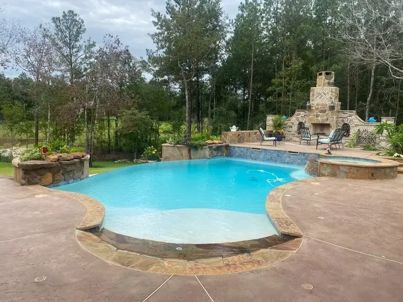A 28’9” x 36’9” freeform pool with a flagstone beach entry, featuring a vanishing edge and an elevated deck area for the fireplace. The fireplace structure is approximately 23’ long and reaches up to 12’ at its highest point.