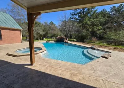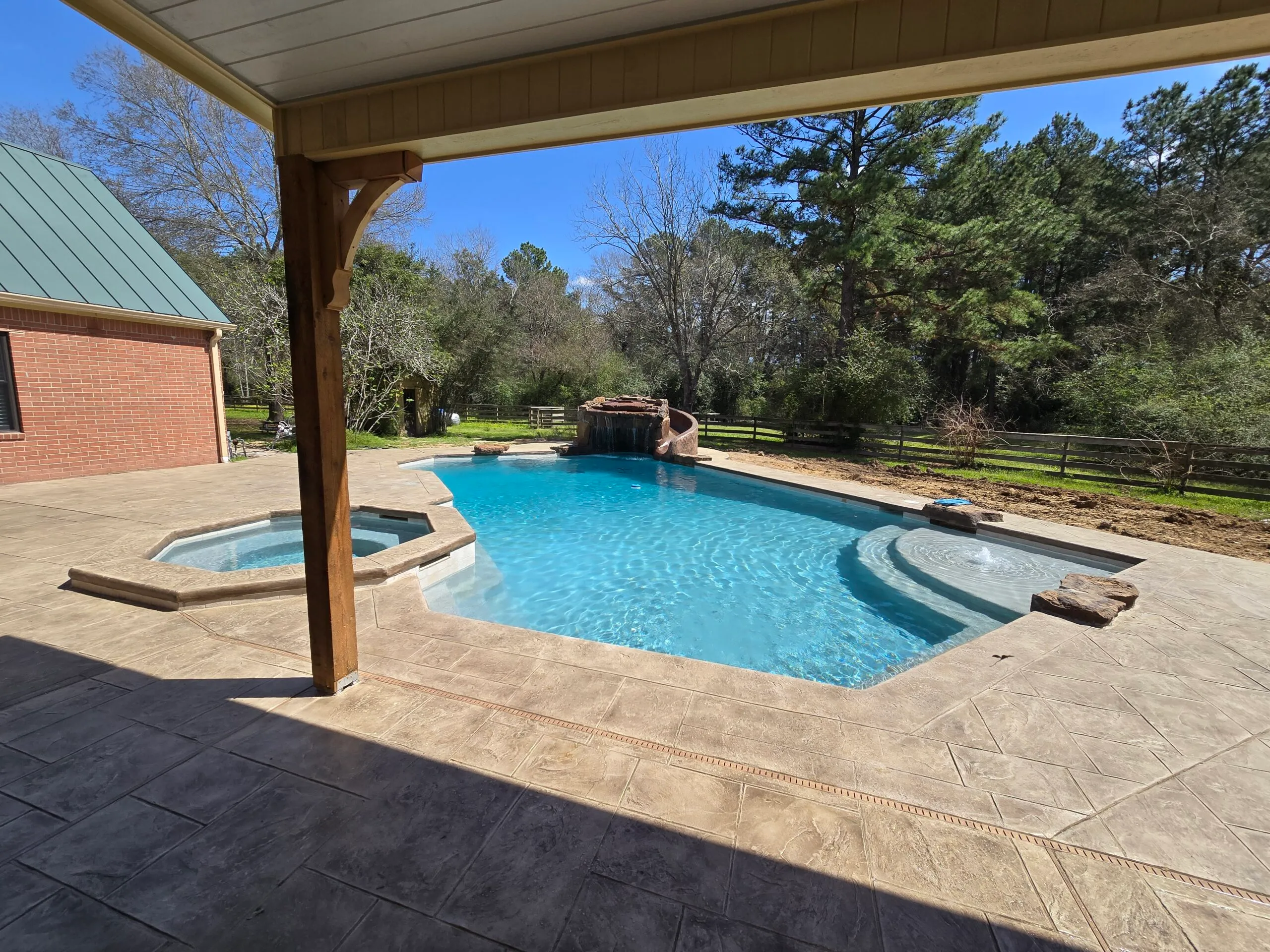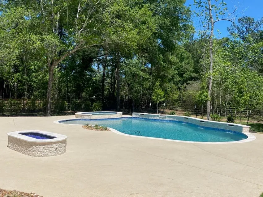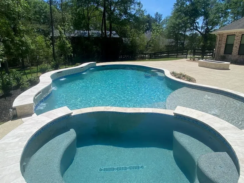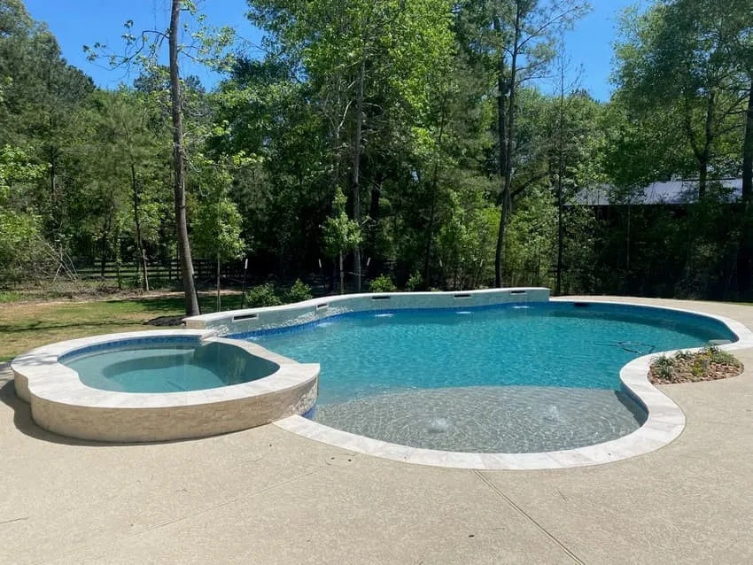 21’ x 37’ custom freeform pool with a raised wall and 5 scuppers.