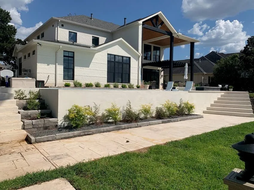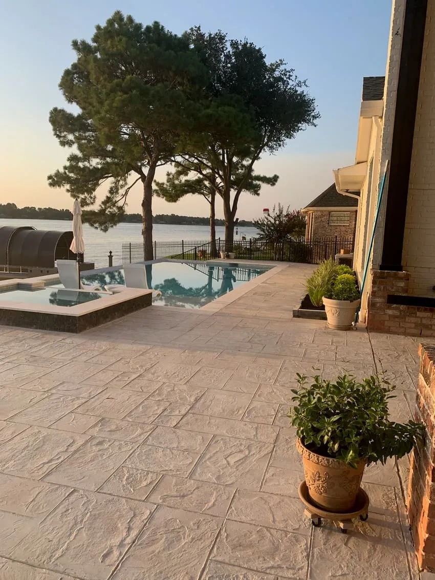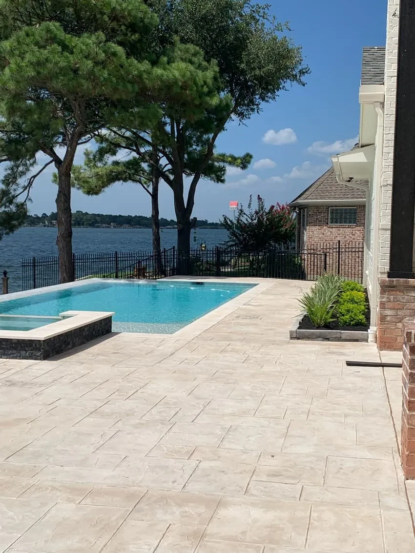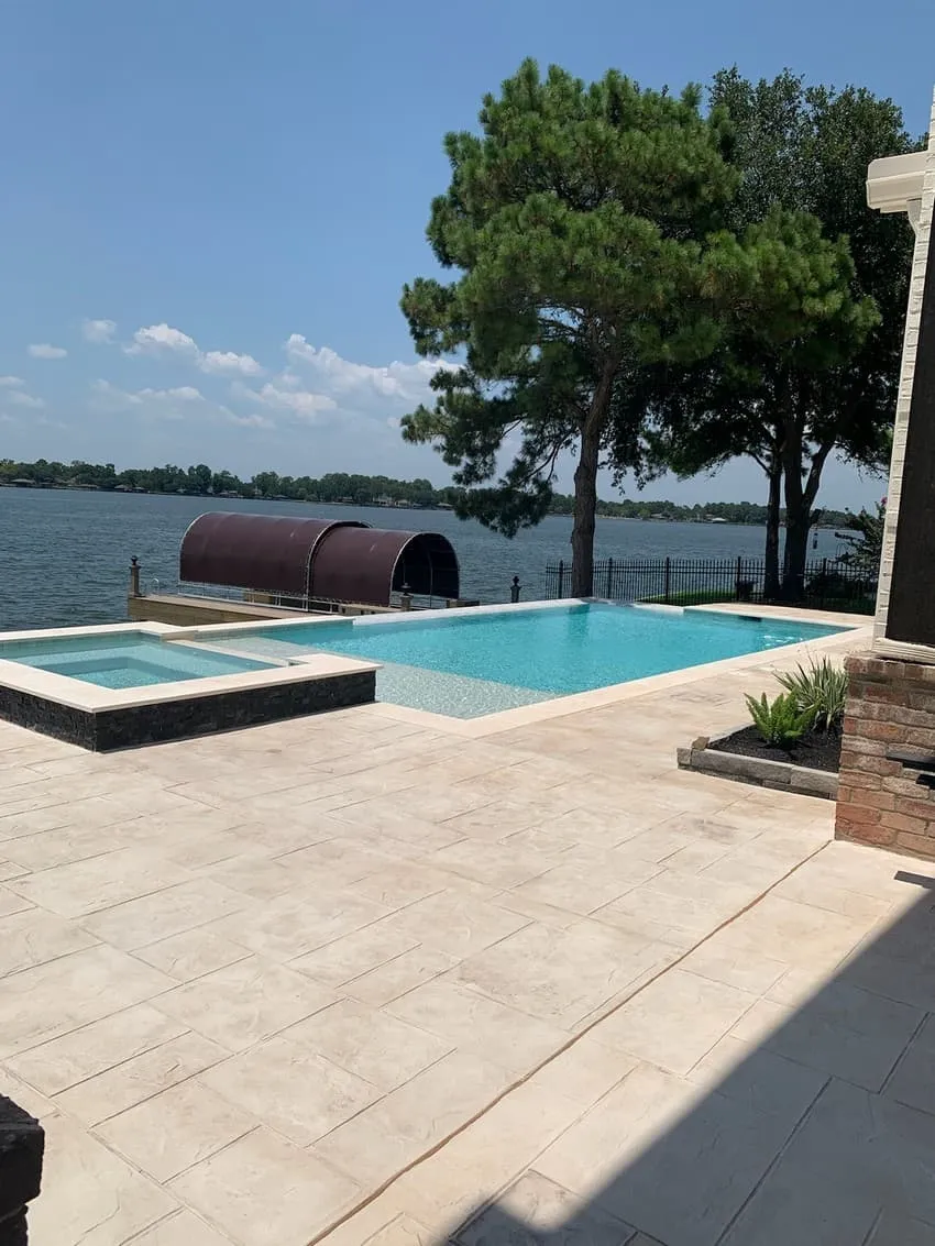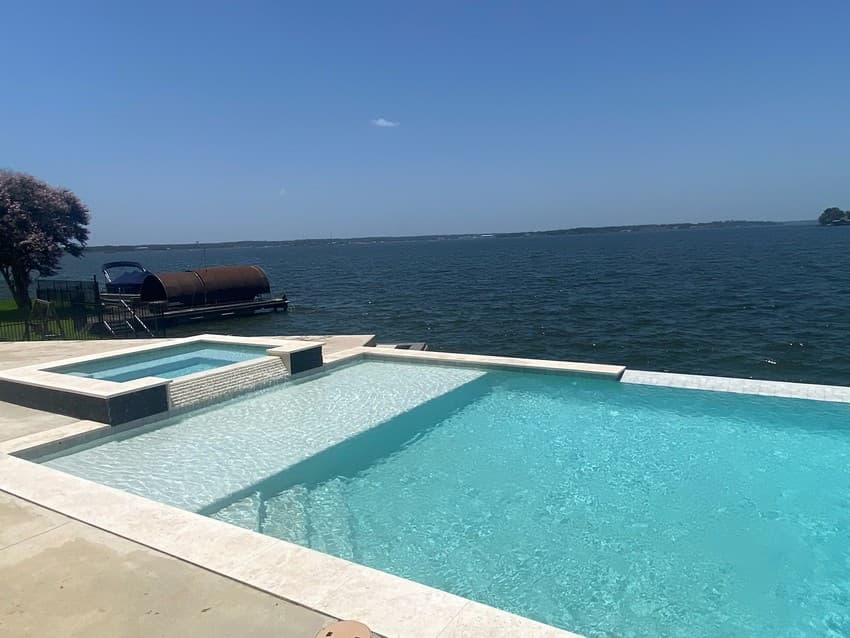 Longmire on Lake Conroe – Conroe, TX 16’6” x 35’ rectangular pool with a disappearing edge looking to Lake Conroe and steps to the lower level.Rectangular 6’ x 8’ raised spa Coping Shell Beige Decking Stamped Concrete Spa Exterior Fascia Black marble splitface Raised Wall Fascia Stucco Plaster Aqua Cool Mini Pebble Puerto Rico Blend